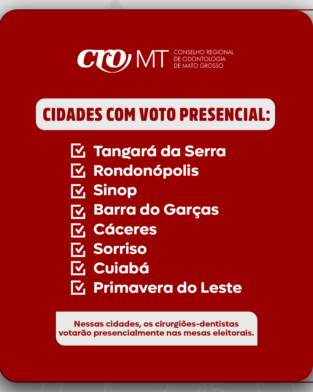 Últimas Notícias14novCRO-MT solicita esclarecimentos ao prefeito de Cuiabá14novHerpes labial e o papel do cirurgião-dentista10novEleição CRO-MT:Voto por correspondência já pode ser enviadoVer Todas as Notícias